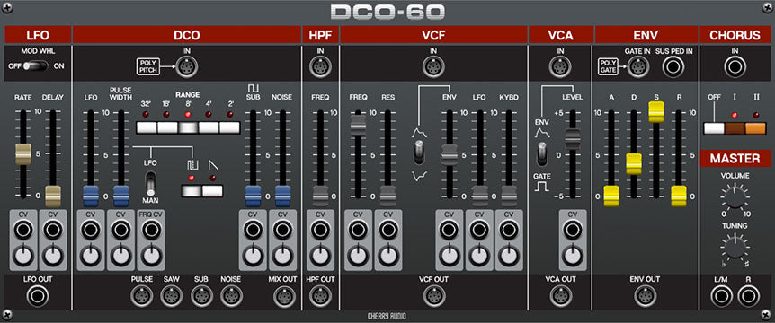 DCO-60 models every element of the beloved classic Juno-106 synthesizer, from its self-oscillating filter to its dreamy chorus effect, all combined in a fully-polyphonic module, loaded with patch points, that has to be heard to be believed. Cherry Audio have even recreated the entire "A" bank of original factory presets.