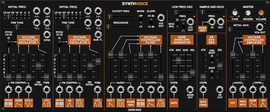 SynthVoice is a complete semi-modular vintage synthesizer, featuring two oscillators, a multi-mode filter, an LFO, dual envelope generators, sample and hold, and spring reverb. It's like having a classic ARP 2600 synthesizer in your modular rack.