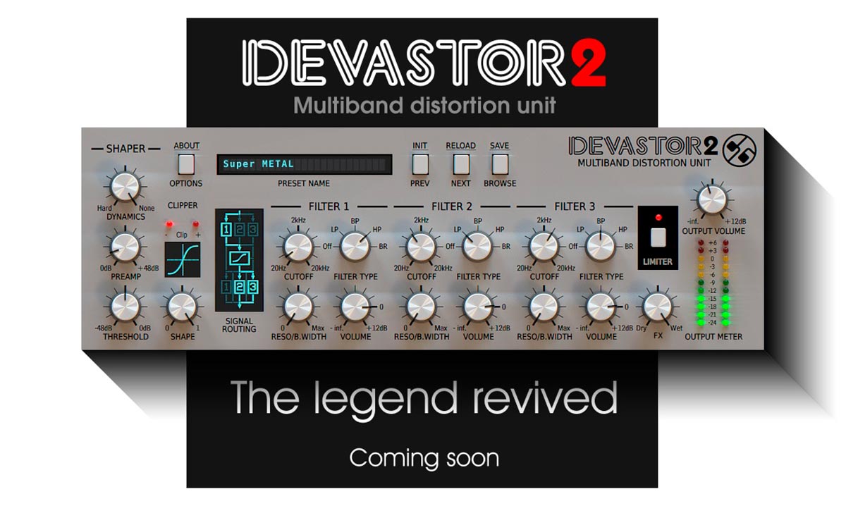 When designing Devastor, we applied special antialiasing techniques to the output signal to make sure it was devoid of aliasing (one of the reasons why digital distortion units can sound so cold and un-musical). As a result, Devastor has a warm, musical, and very high quality sound.