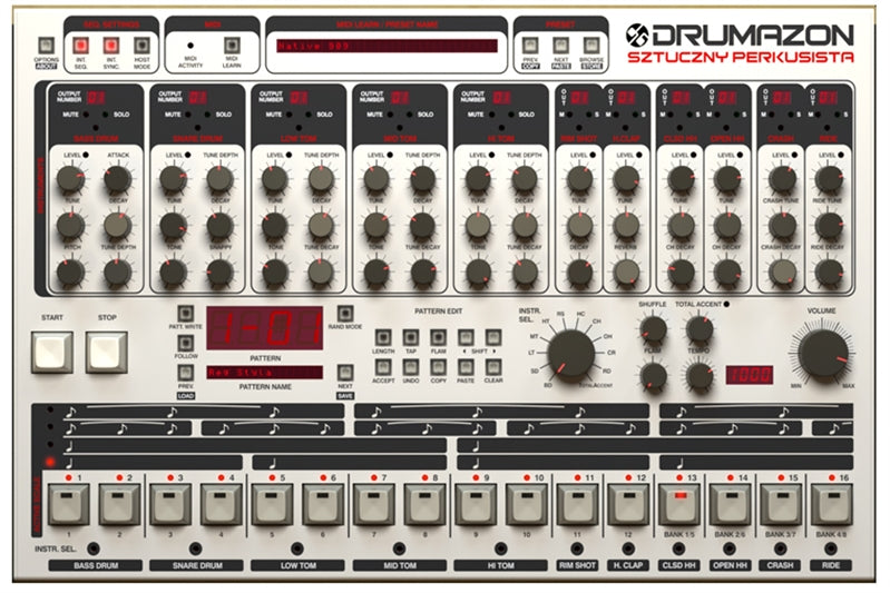 Drumazon has extensive midi control. Midi notes can be used to trigger each individual sound. Alternatively, the internal sequencer can be used. This can be set to play using Drumazon's internal clock or set to synchronize as expected to the host sequencer. Most of Drumazon's parameters can be automated within the host or controlled via MidiCC by an external controller. An easy-to-use Midi Learn function allows instant reassignment.