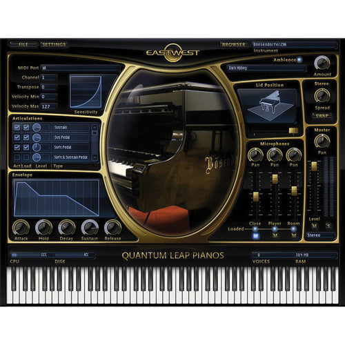 Available for download, the EastWest Quantum Leap Piano Platinum Bundle packages together four high-quality libraries for your convenience. Four pianos are included: a Bechstein 280, a Steinway D, a Yamaha C7, and a Bosendorfer 290. The first three pianos are 88-key concert grand models. The Bonsendorfer sports an extended low range, with 98 keys.