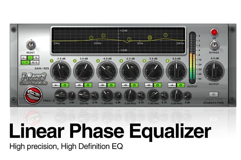 As an added plus to the Linear Phase response the T-RackS Linear Phase EQ boasts six bands of fully parametric equalization. Each band can be configured to work as a high pass, low shelving, peaking, high shelving or low pass, thus making the module extremely flexible.