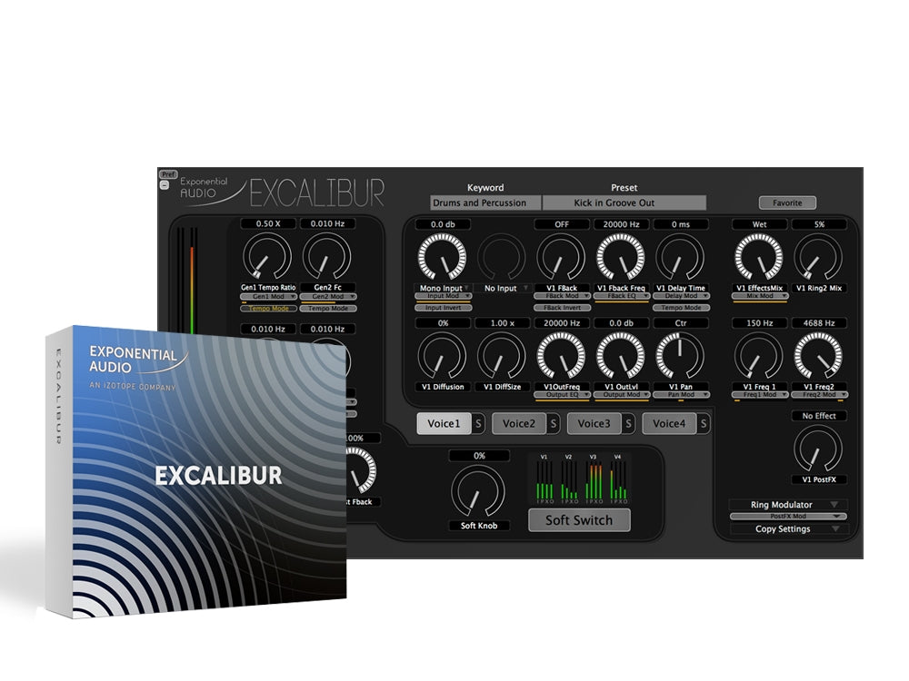 Excalibur is a stereo multi-effects plug-in unlike any other. With several modulation, pitch-shifting, and dynamics effect modules, Excalibur has the creative tools to tackle any music production, post production, or sound design project. Four independent voice oscillators can subtly change the timbre of your recordings or drastically transform any audio source with swirling kinetic effects.