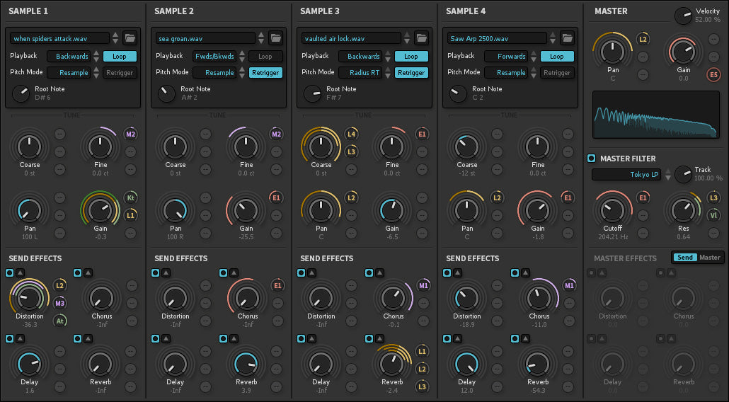 Spectral Filtering - Load up to four individual audio files to form your sound, and "paint" filters onto each sample using Iris 2's unique Spectral Filtering system