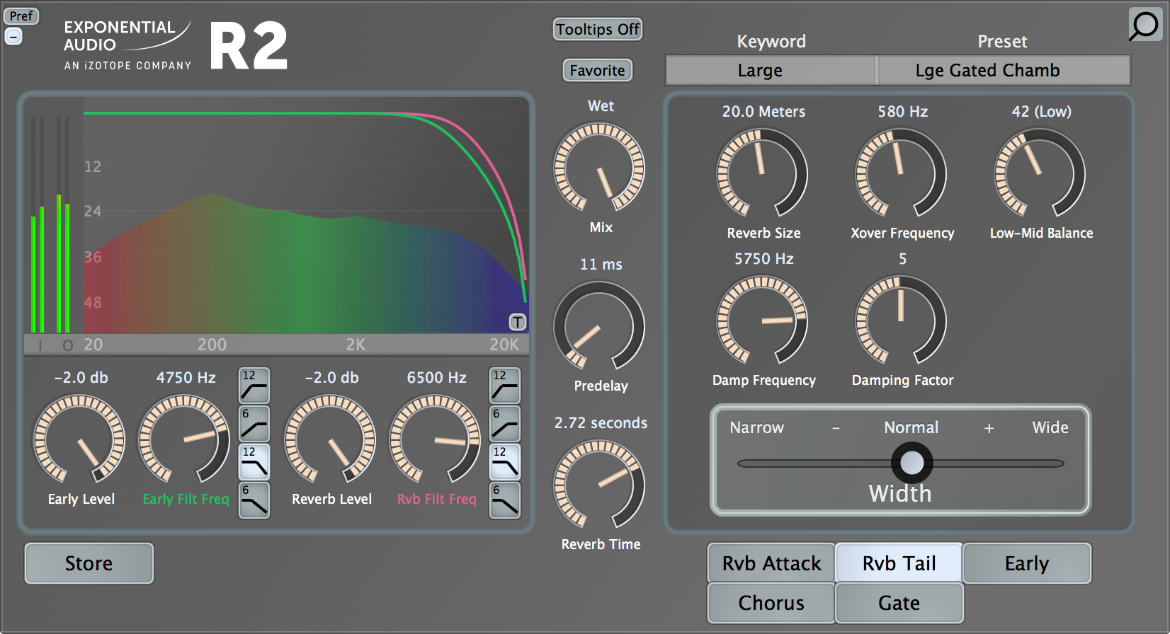 R2 introduces a lush, colorful stereo reverb algorithm to Exponential Audio’s familiar design. Use the chorus and gate effects to color and shape your reverb signal to suit any music project. From swirling orchestral chambers to minimal, clean room reflections, R2 is your go-to plug-in for designing completely unique, musical spaces.