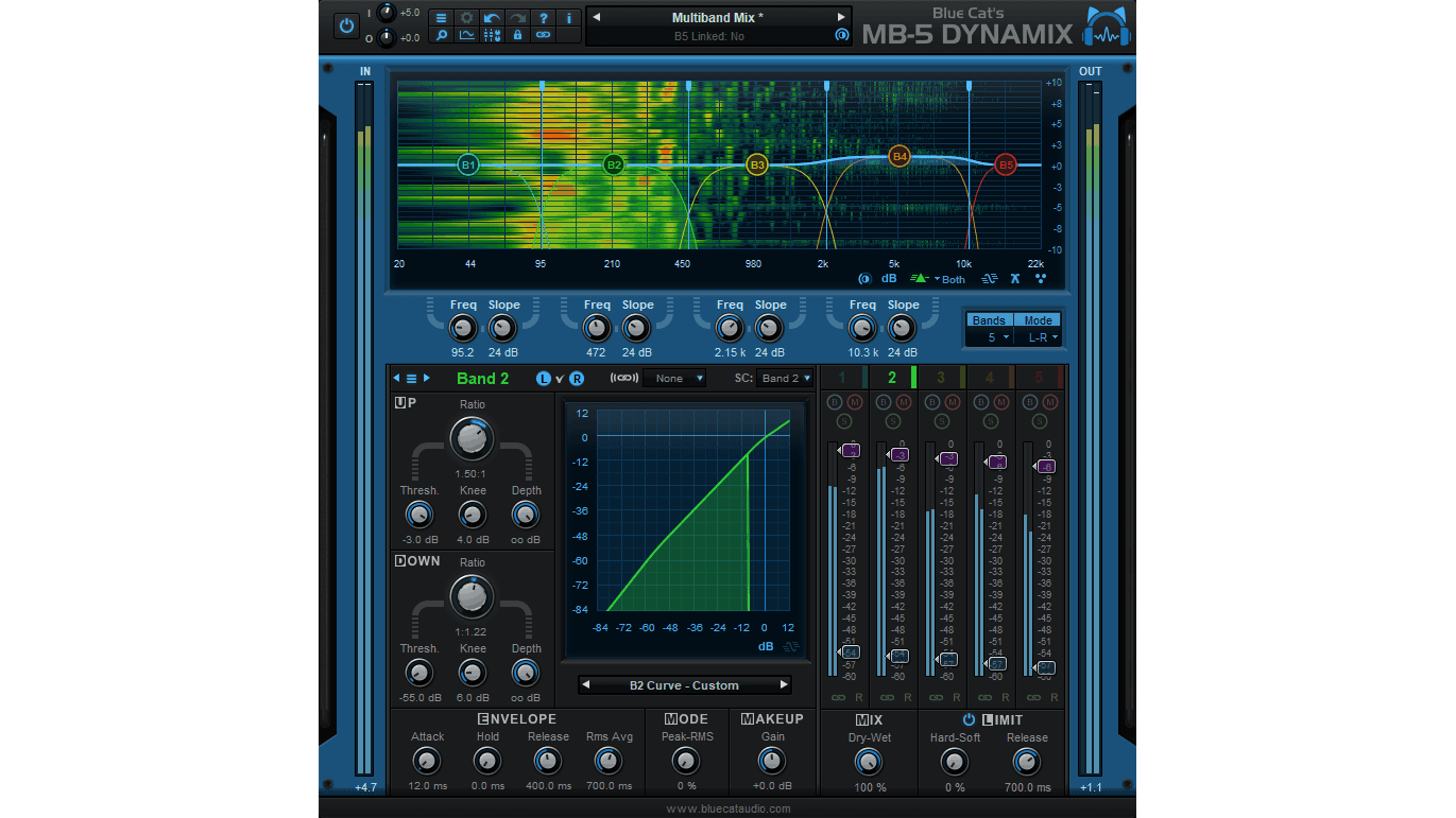 Blue Cat Audio MB-5 Dynamix is an extremely powerful all-in-one multiband dynamics processor: it can be used as a multiband compressor, limiter, gate, expander, waveshaper or all combined at once, on any part of the spectrum. The unique dynamics processing section of the Blue Cat Audio Dynamics plug-in has been streamlined and integrated in this plug-in to process each one of the 5 bands separately.