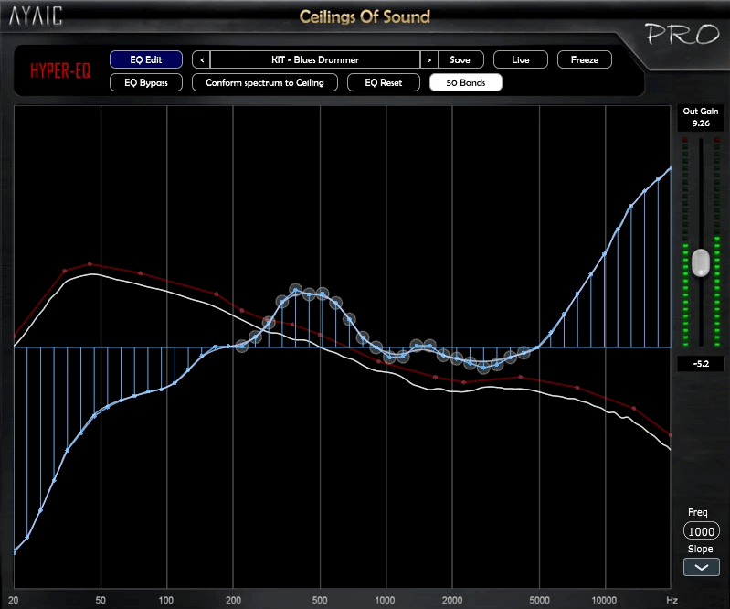 Ceilings Of Sound PRO is AYAIC's first Hyper-EQ, and it's an equalizing beast! AYAIC coupled the 15-ceiling bands and automatic ceiling generator with a 50/31 band Linear Graphic EQ...then we added a "conform spectrum to ceiling" feature that automatically conforms the EQ to the created ceiling shape.