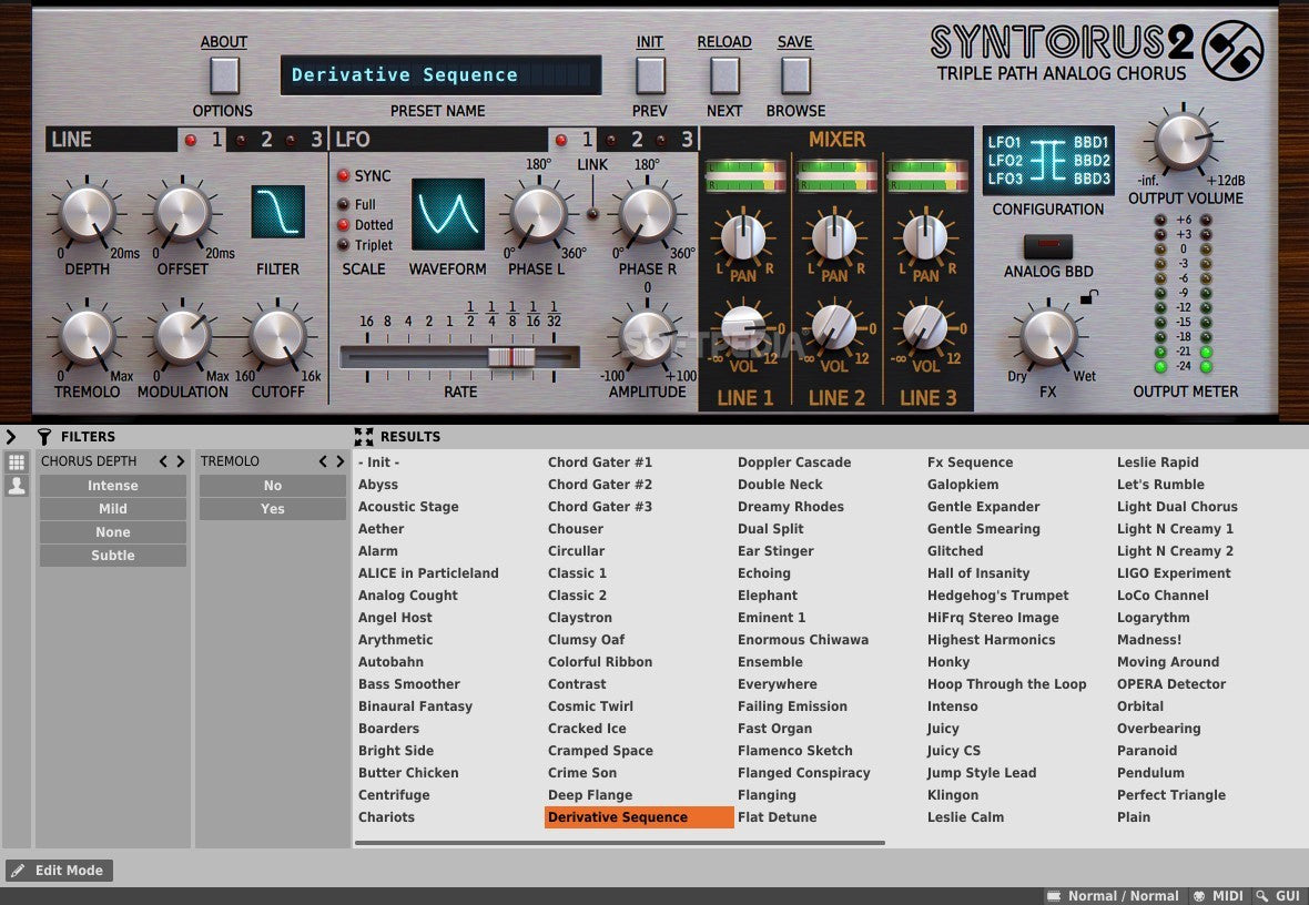 Most chorus effect units use just a single delay, but Syntorus 2 deploys three analog delay lines to conjure a richer, fuller, deeper chorus sound. It also gives you a choice of two BBD delay line models: by default, the chorus effect is exceptionally clean and pristine, but activating Analog BBD Emulation adds even more analog warmth and character to the signal. And needless to say, full control is granted over all delay line parameters, giving you absolute freedom in sculpting your sound.