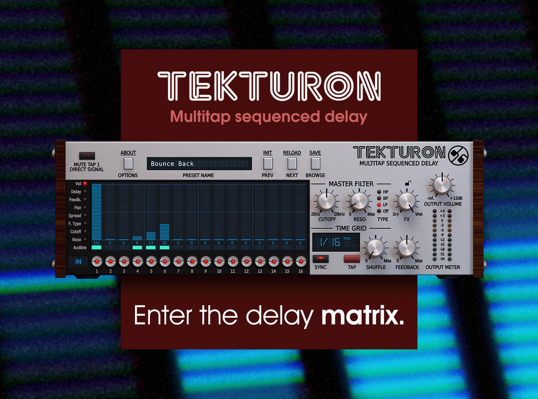 Tekturon is a multitap-delay effect with 16 independent, high-quality delay lines. What really sets it apart from other, similar products, however, is the way it’s controlled and the unique topology into which the taps are arranged: The Delay Matrix. In fact, Tekuron can't be thought of as a tap-delay effect in the strictest sense, but more of a sequence of taps equally delayed from each other, whereby working with the plugin strongly resembles using a step sequencer. This rather unusual design should give your creativity just the kick it needs!