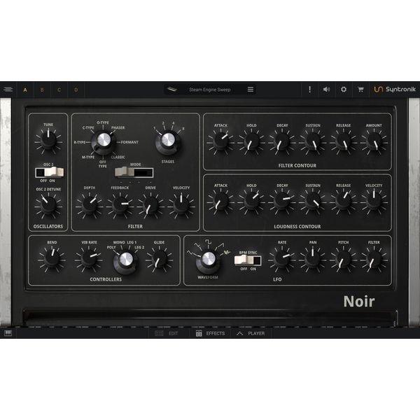 - Edit window with modulation matrix, extra oscillators, sub-oscillators, envelopes and LFOs