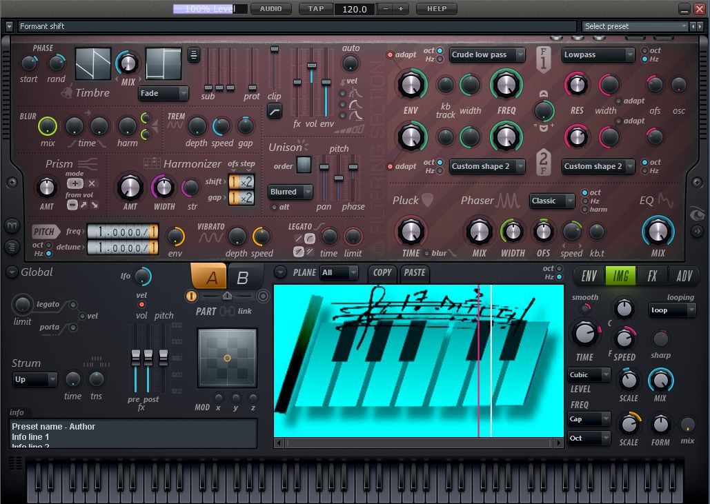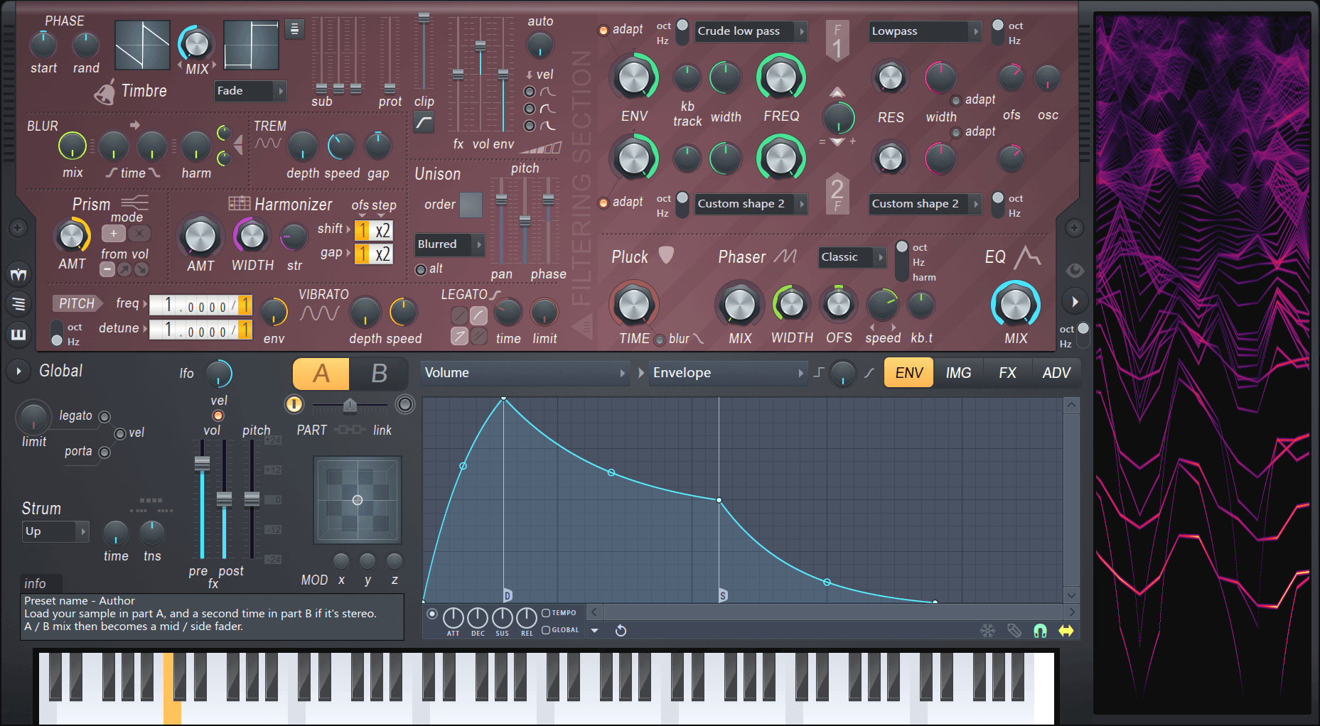 You wanted more, so also featured is the multipoint envelope editor of Sytrus fame, applied to over 40 parameters, in 2 independent parts. Through the same envelope/mappings, randomize any parameter or link it to key or velocity, and even fine-tune each unison voice independently.