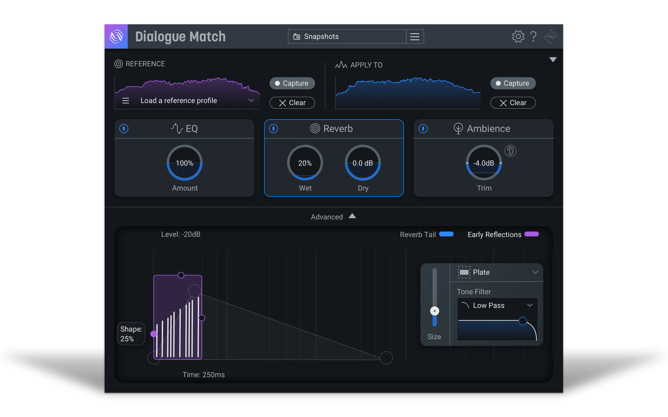 Leveraging parametric EQ matching mechanics, Dialogue Match matches the tonal and spectral aspects of any piece of dialogue and applies it to another.