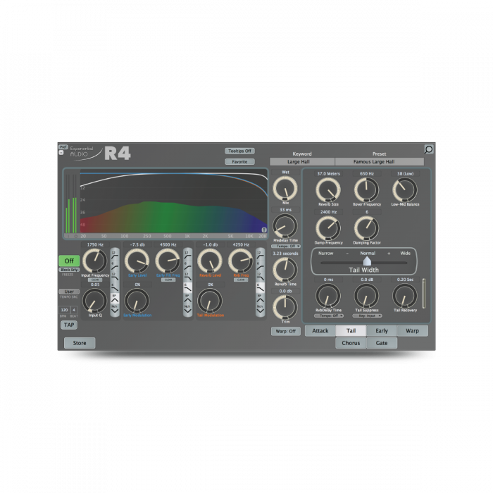 R4 includes an array of time-twisting creative effects. Freeze gives you the ability to easily stretch an instant of reflected sound into infinity, and can also be combined with the Warp module’s overdrive and compression to craft a dramatic sustained reverb drone or striking cinematic ramp effects.