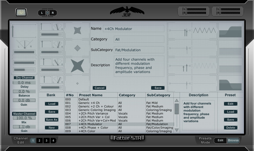 KR-Fatter STR can be used to enhance the spectral content of audio signals containing vocal, instrument or synthesized sound recordings. By using different combinations of the available modules KR-Fatter STR allows the creation of different effects like Fattening, Spectral Coloring, Imaging, Harmonizing, Pitch Shifting, Delay, Modulation and other Special effects. Special attention was given in the design of this processor in the use of Naturally perceived randomization of the available functions in order to produce a spectrally evolving output. These randomizations implemented using Fractal algorithms can transform dull static audio signals into vibrant, rich and natural sounding recordings.