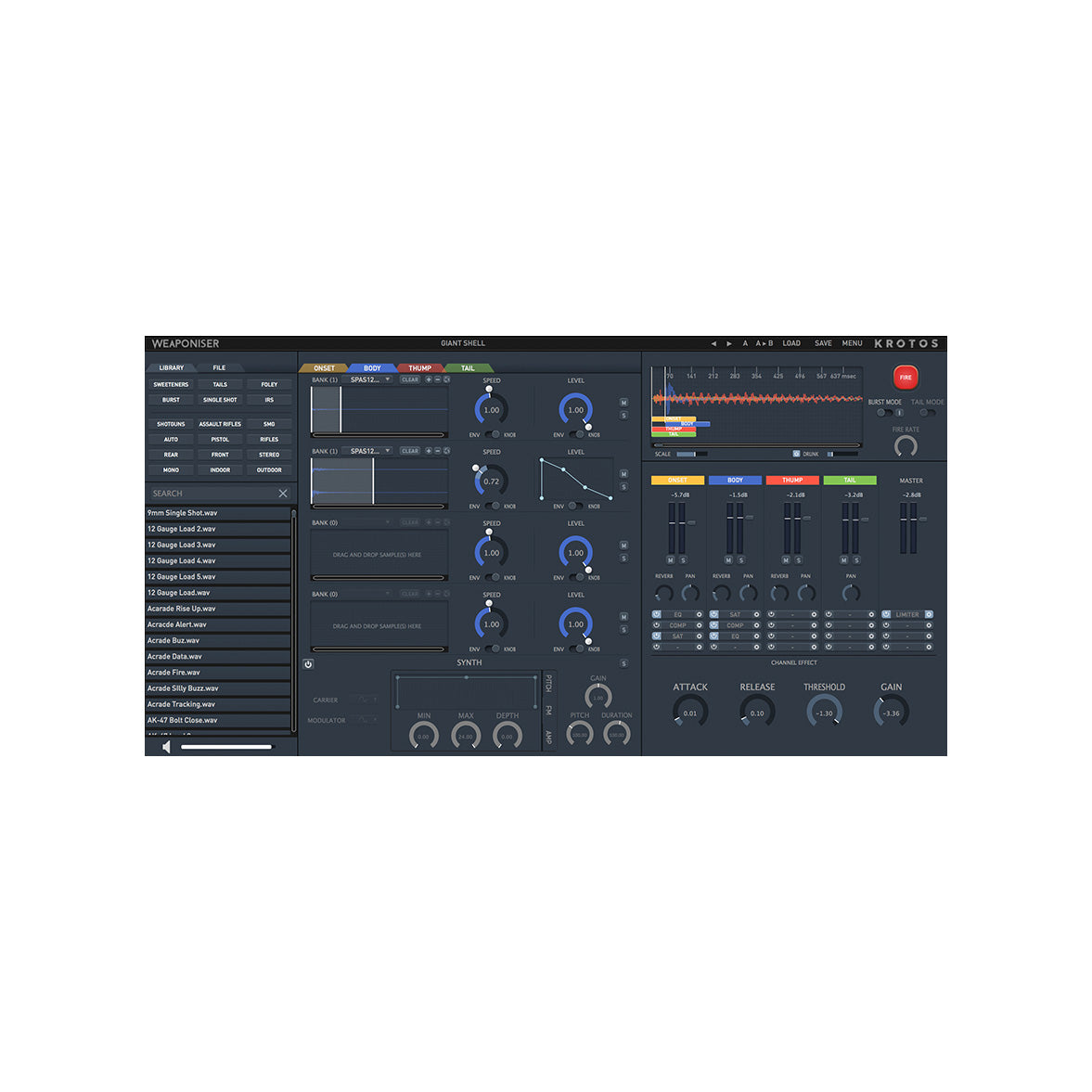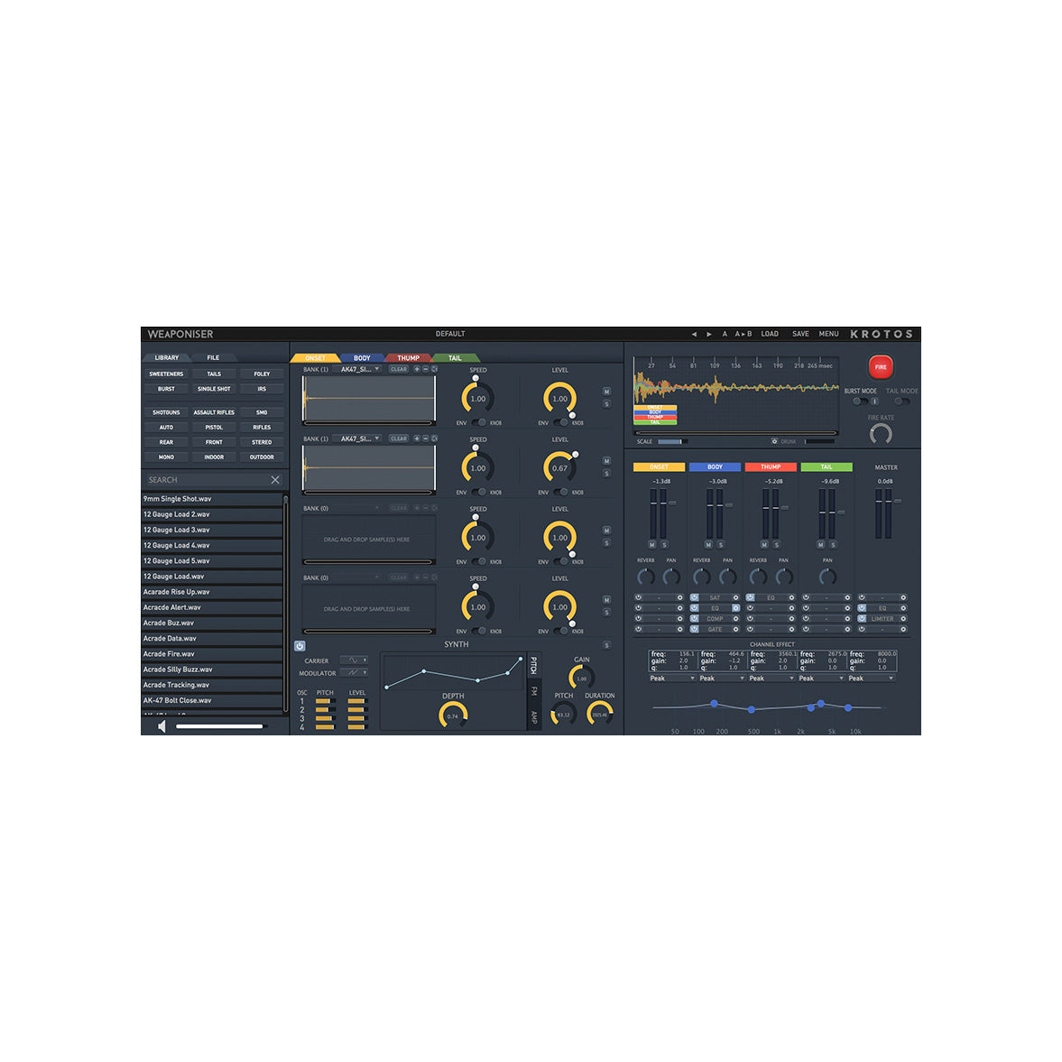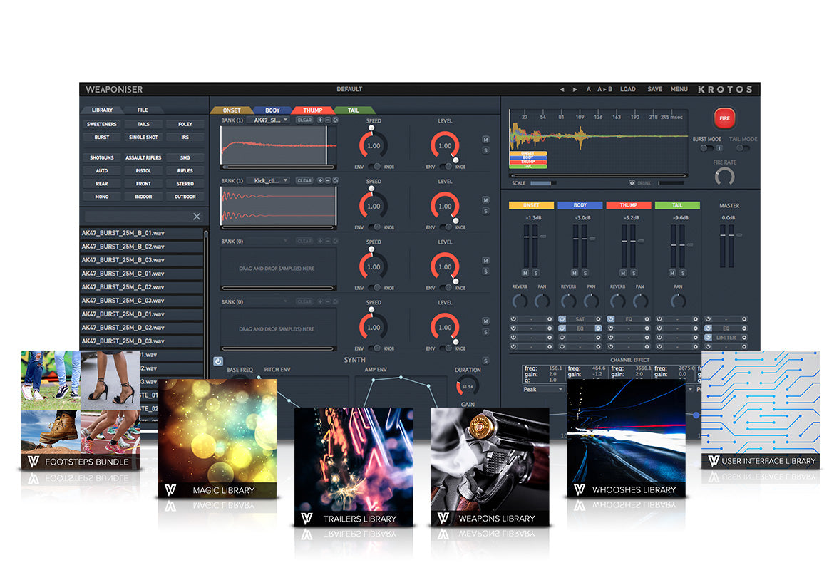 Select from and customize up to 1594 weapon recordings, layer and process through four engines, synthesize, add fx, sequence to a built-in timeline and render.