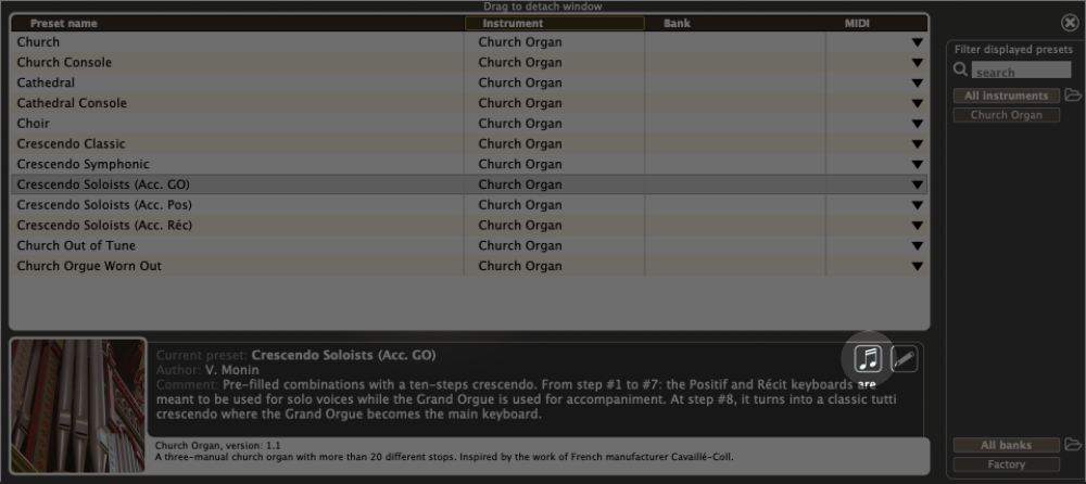 Combining the stops in various way offers a wide sound variety. The task may seem unreachable for non-organists. Organteq makes things easy for you and offers seven presets with pre-filled combinations (i.e. pre-filled registrations) which let you explore new amazing sound colours.