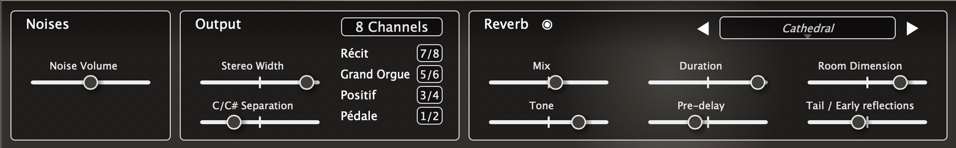 Organteq offers over a thousand pipes, inspired from Cavaillé-Coll's organs, assigned to three manual keyboards with a five-octave range, and a pedal keyboard with thirty-two notes. Each keyboard can be assigned to a selection of stops with adjustable parameters.