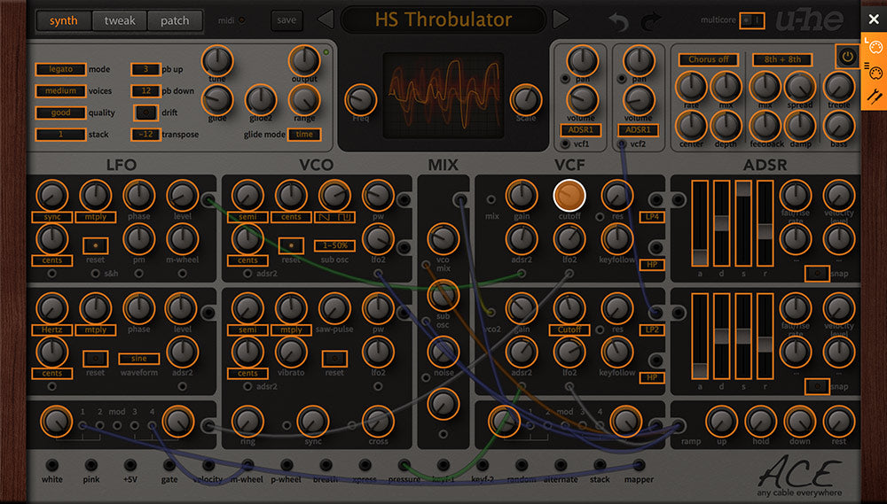"Any Cable Everywhere" modular synthesiser with over 30 signal sources and targets